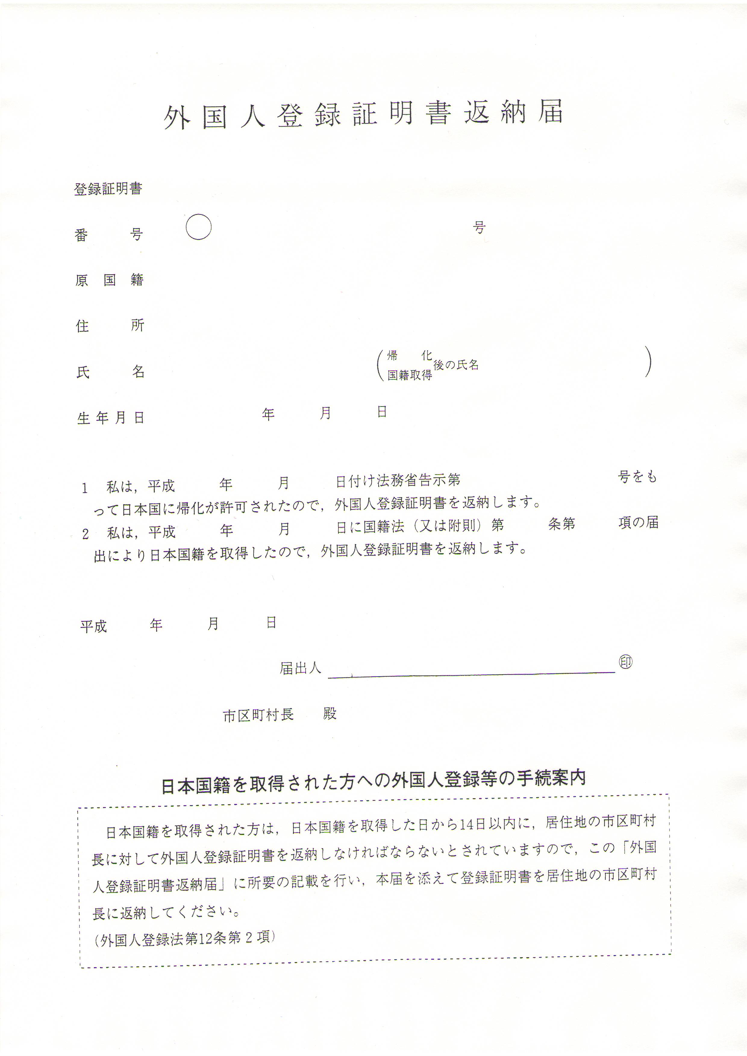 外国人登録証明書返納届 帰化の日から14日以内に、この届と一緒にカードを返納します。 「帰化届」を提出する時に、一緒に提出(返納)すると良いでしょう。